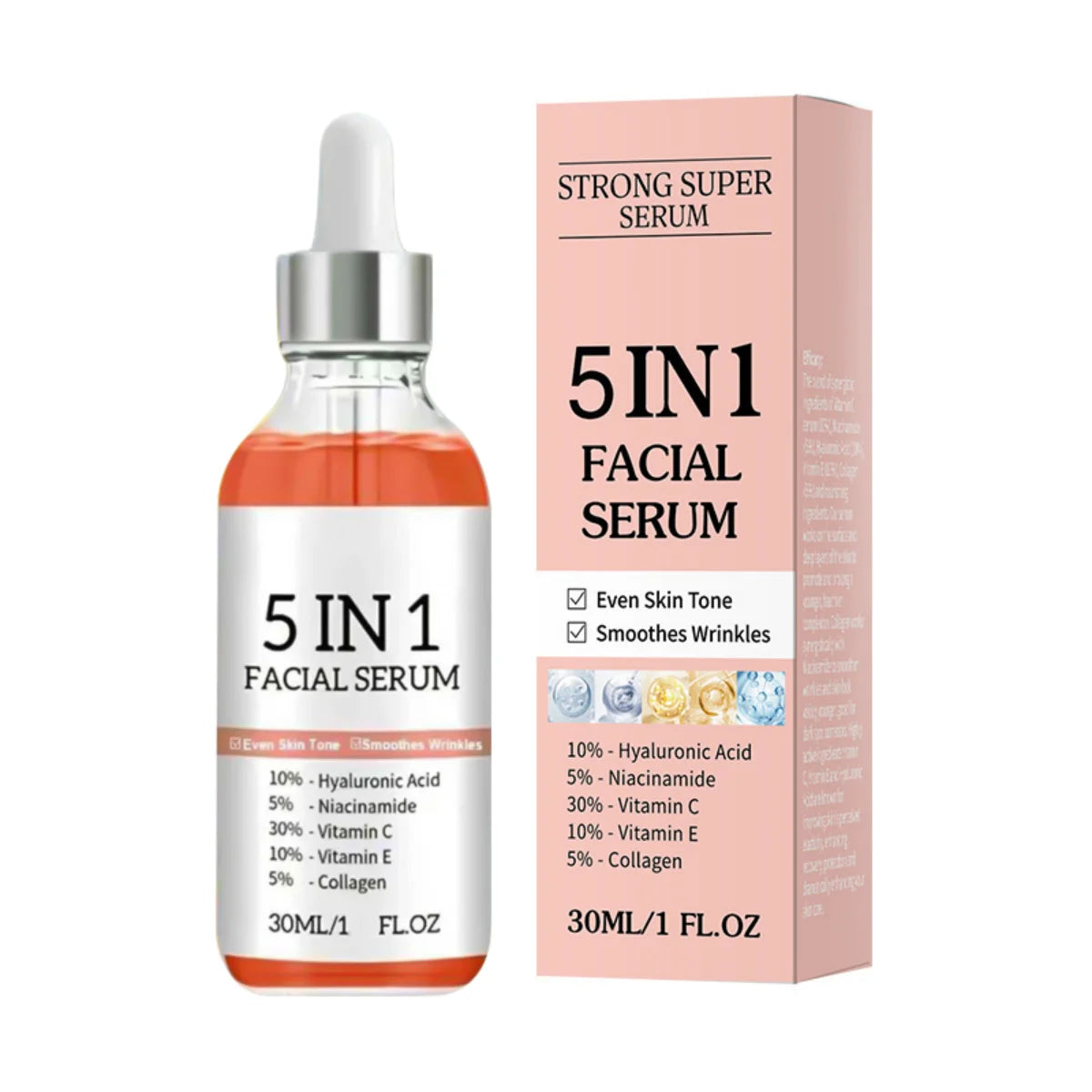 Revitalize your skin with this 5-in-1 Face Serum, formulated to target multiple skin concerns in one step. Enriched with Vitamin C and hyaluronic acid, it helps fade fine lines, firm sagging skin, deeply moisturize, brighten the complexion, and shrink pores for a smooth, radiant appearance.